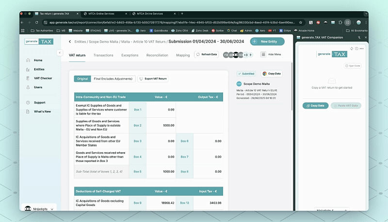 The generate.TAX VAT Companion is a powerful browser extension that simplifies the final step of your VAT compliance process. Seamlessly transfer your VAT return data from generate.TAX to your local tax authority’s online portal, eliminating manual data entry and reducing the risk of errors. generate.TAX also extends your accounting software dashboard with additional VAT related functionality including submitted and upcoming VAT returns.